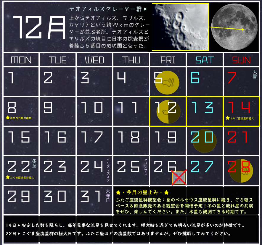 何と言っても『ふたご座流星群』が最大の目玉!!今年は極大のタイミングが良いので、普段よりも多く流れ星を楽しむことができる可能性が大です!ぜひ、ふたご座流星群は当館で流れ星探しを楽しんでいただければ幸いです!なお、『ふたご座流星群観望会』を今年も開催!しっかり防寒対策をして遊びに来てくださいね~!惑星も土星と木星、両方楽しめる時期がやってきました!冬の星と惑星、流れ星の全部盛り!!また、お誕生日星座は『おひつじ座』『おうし座』『ふたご座』が見頃です。