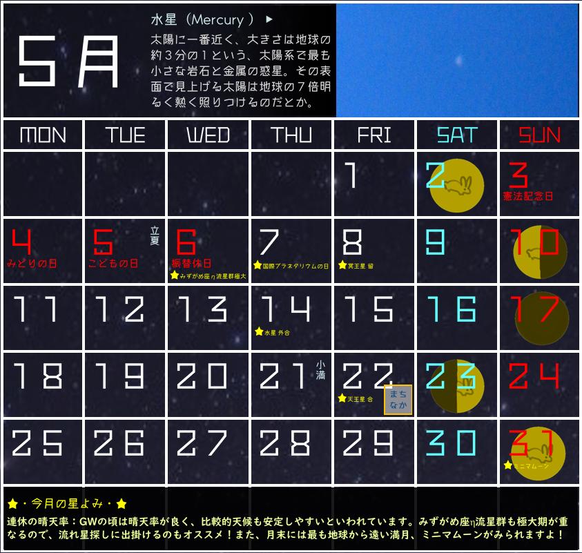 また、GW前半は月のクレーターが見られる時期、後半は満天の星が見られる時期となります!今回の連休は2度美味しい!!?